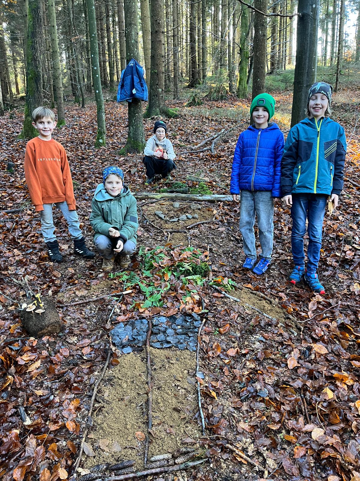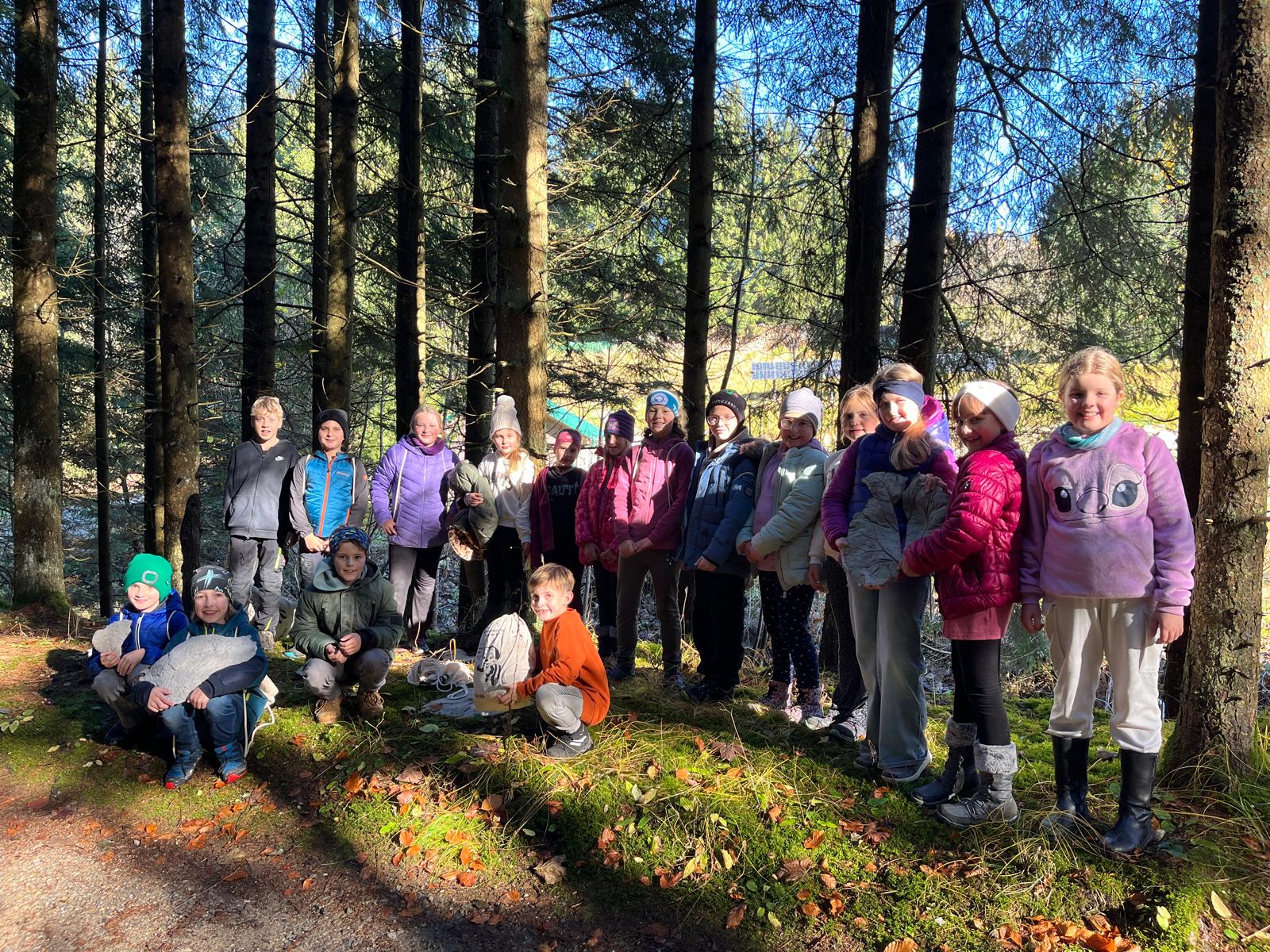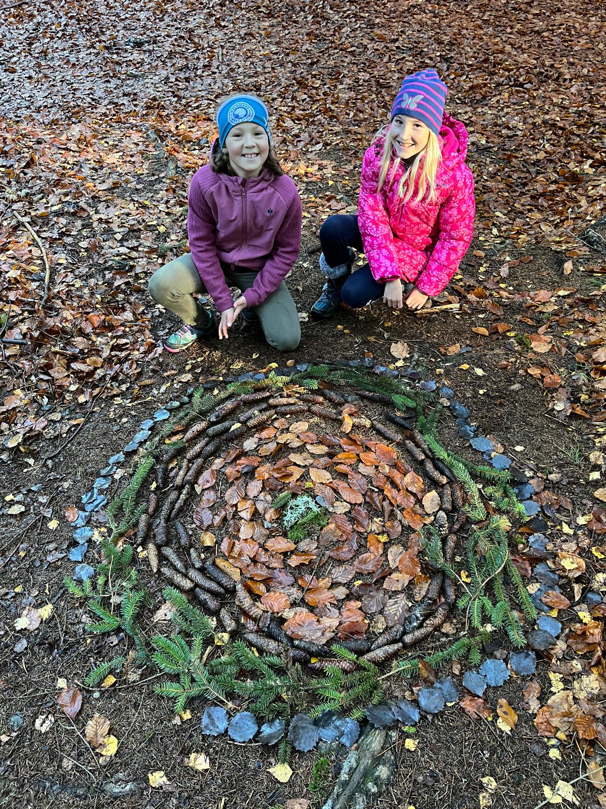 Die 4. Klassen gestalteten in Werken Betonschalen mit der Blätterdruckmethode. Diese haben sie an einem sonnigen Herbsttag entlang des Familienwanderweges aufgelegt, wo sie nun von allen bewundert werden können. Im Zuge dessen wurde die Zeit im Wald genutzt, um kreative Naturkunstwerke (Landart) zu kreieren.